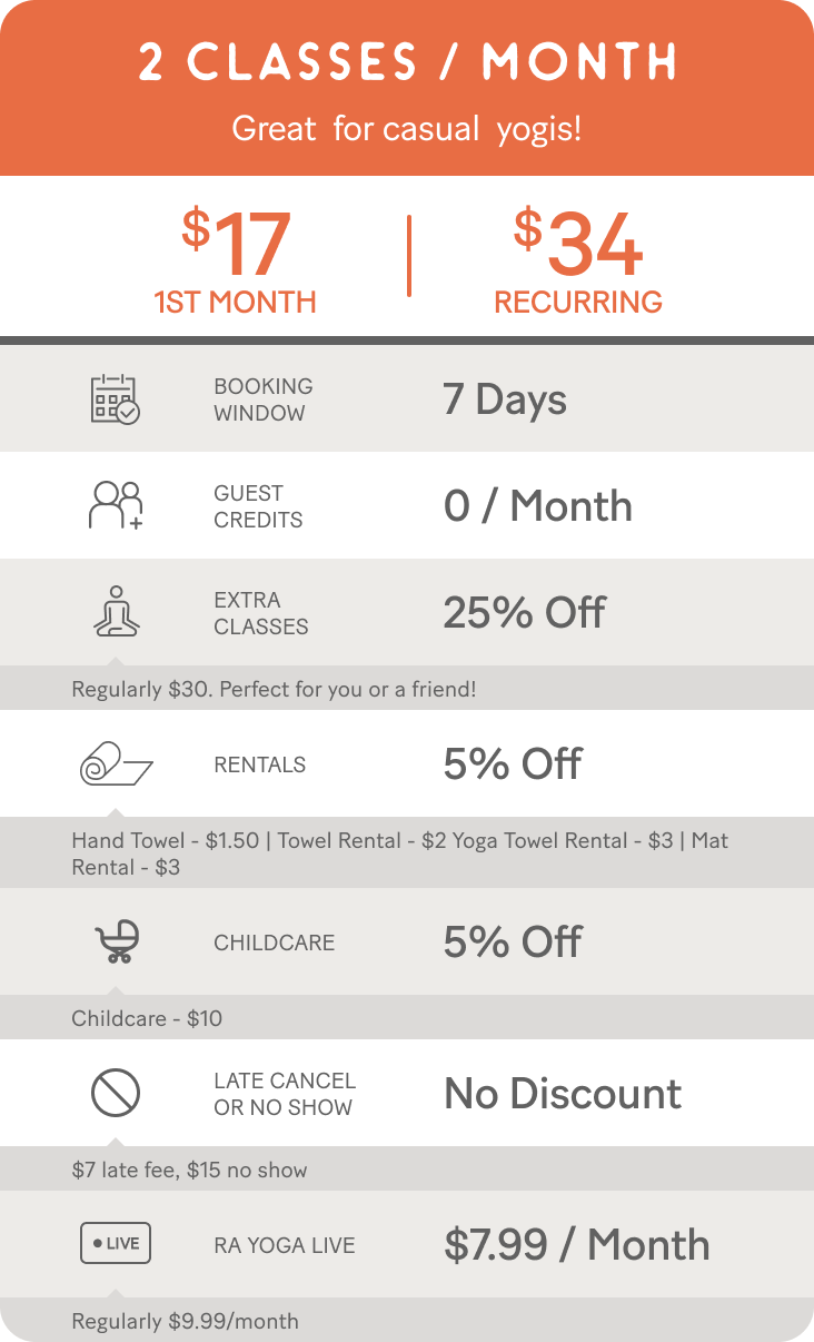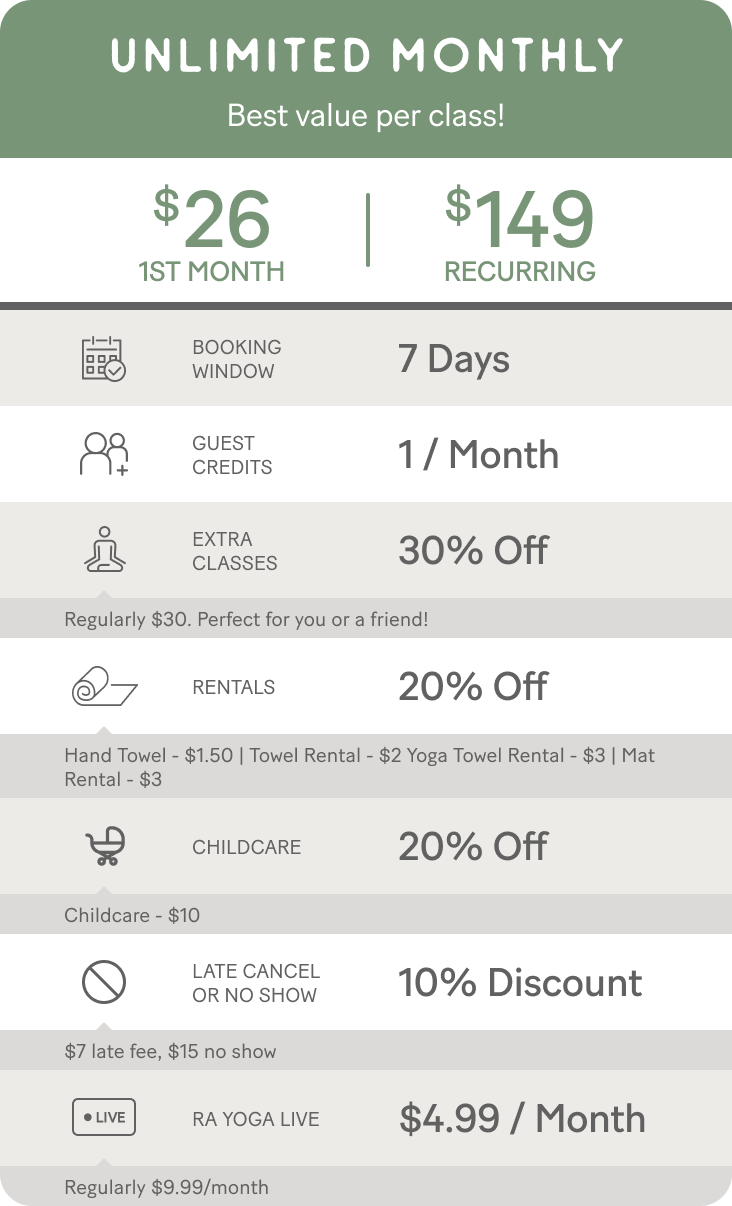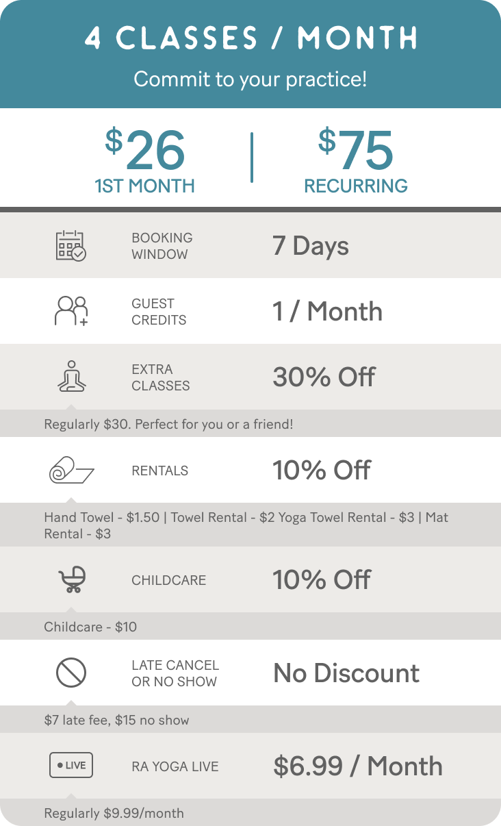 Ra Yoga understands that clients have different needs, so we designed many affordable limited and unlimited yoga membership options (6 month minimum contract).